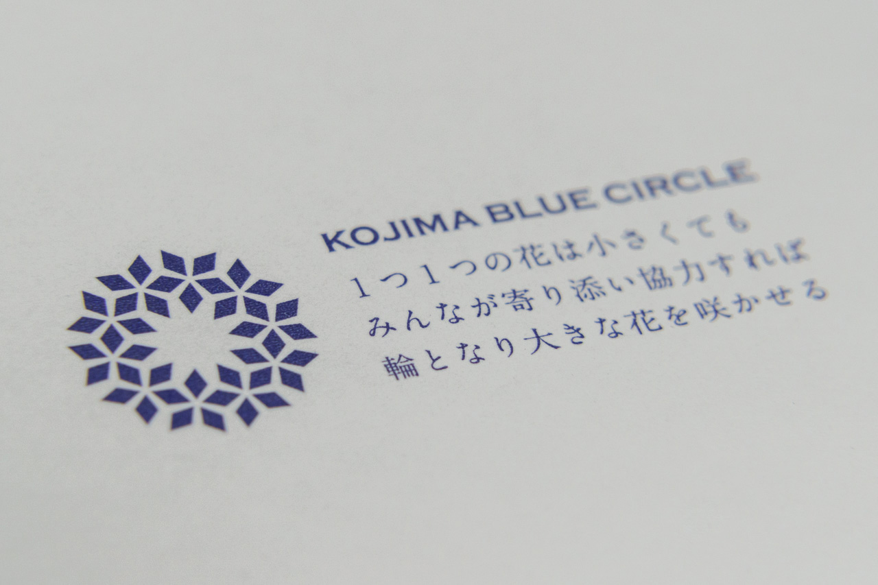 新デザインの封筒は、日本の伝統色である「群青色」をベースにしています。「青き群れが集う」というカラーコンセプトが込められており、ロゴマークは「1つ1つの花は小さくてもみんなが寄り添い協力すれば輪となり大きな花を咲かせる」をイメージしており、中央の白い輝きで「夢・希望・未来」を表現しています。そして「KOJIMA BLUE CIRCLE」という「児島の青い輪」の意味が込められています。